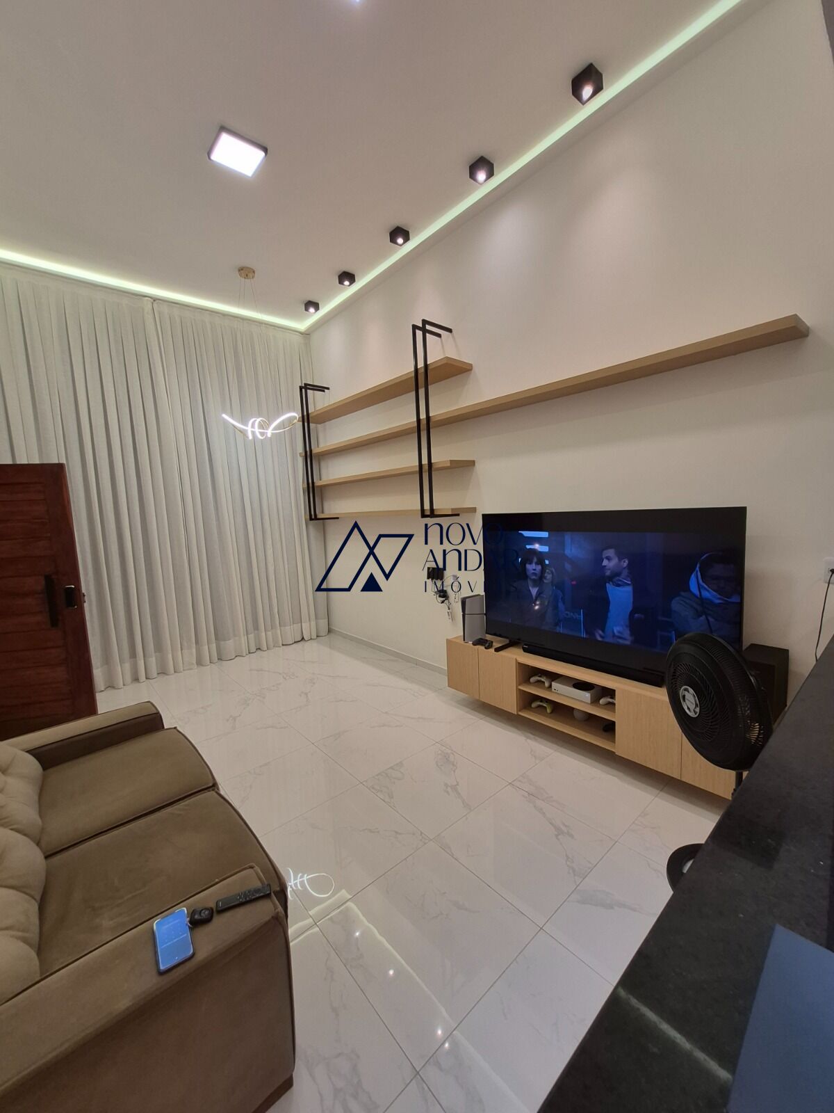 Prateleiras decorativas, cortinas e rack para TV de até 80 polegadas