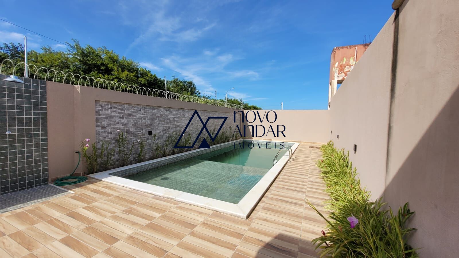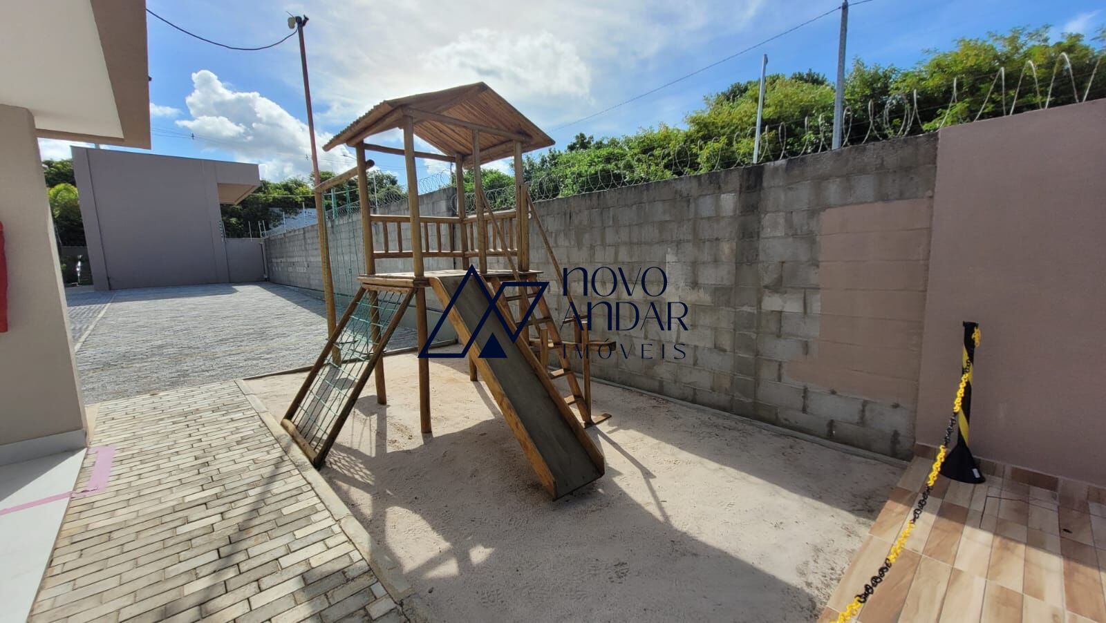Area de lazer com piscina, playground, churrasqueira, salão de festas e cozinha.