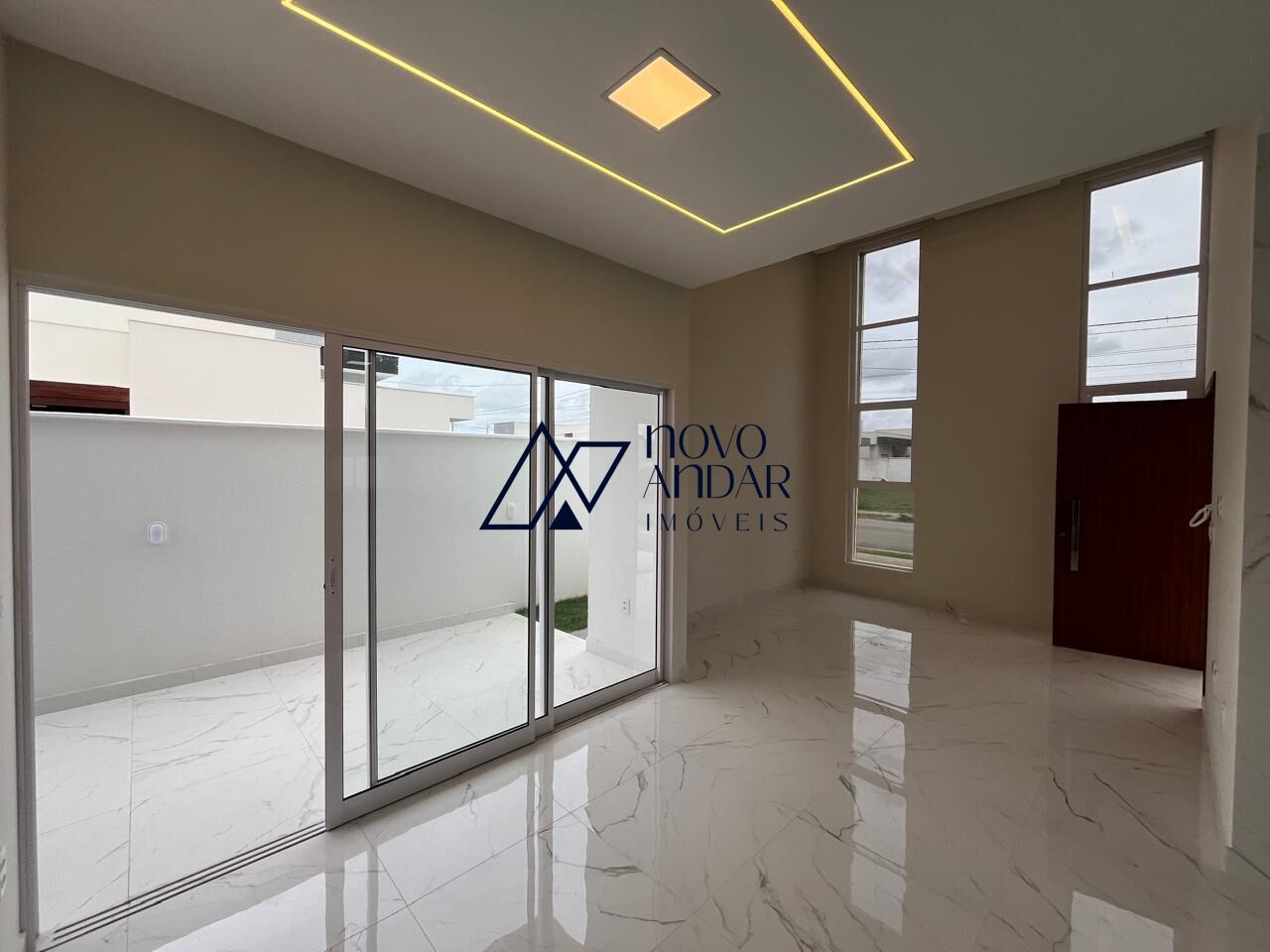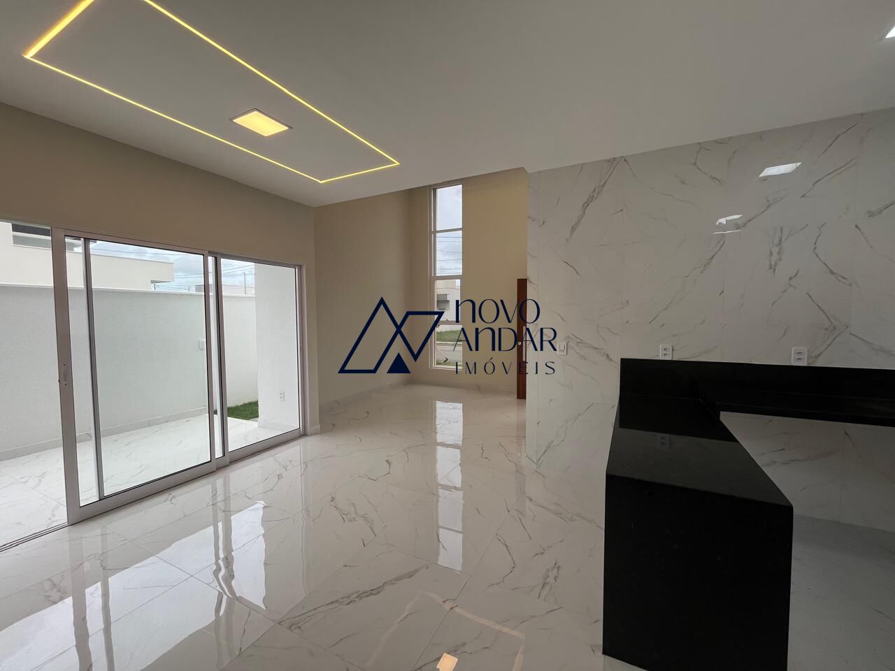 Casa com Pé direito duplo, piso porcelanato, instalação para ar condicionado, projeto de iluminação com led